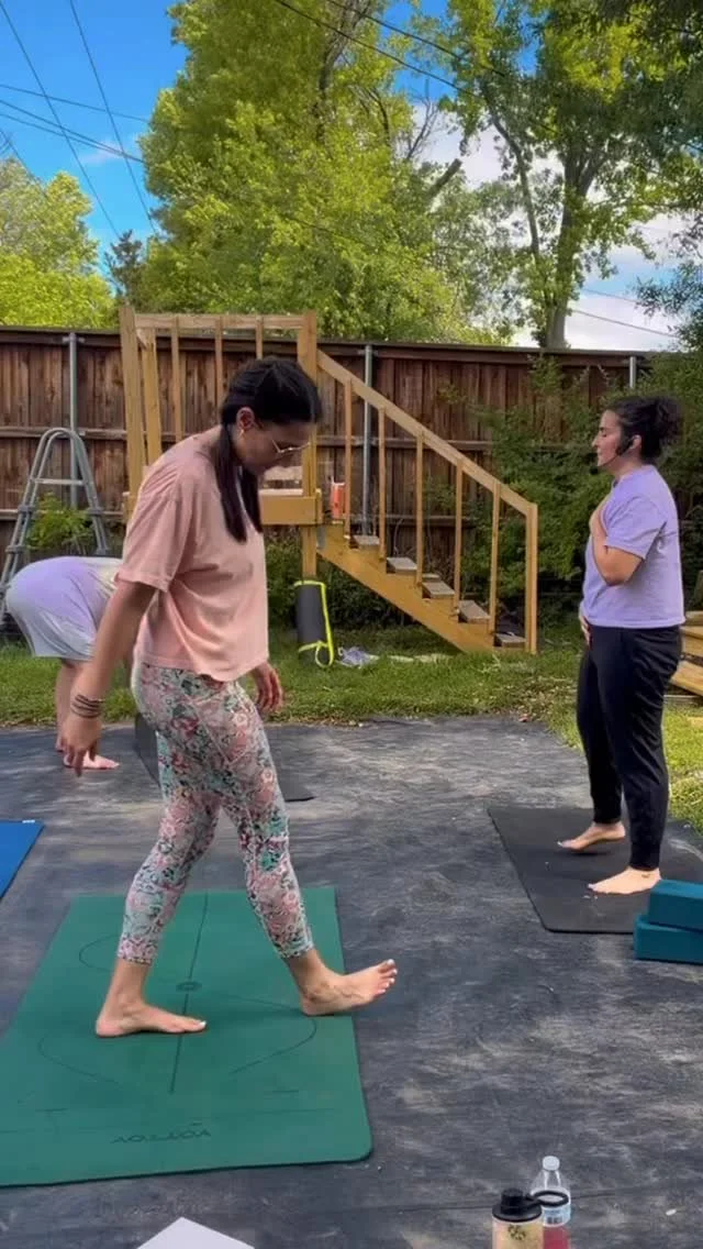 A woman in black yoga attire receiving a flower from a yoga instructor during an outdoor yoga session on a sunny day, with buildings and greenery in the background.